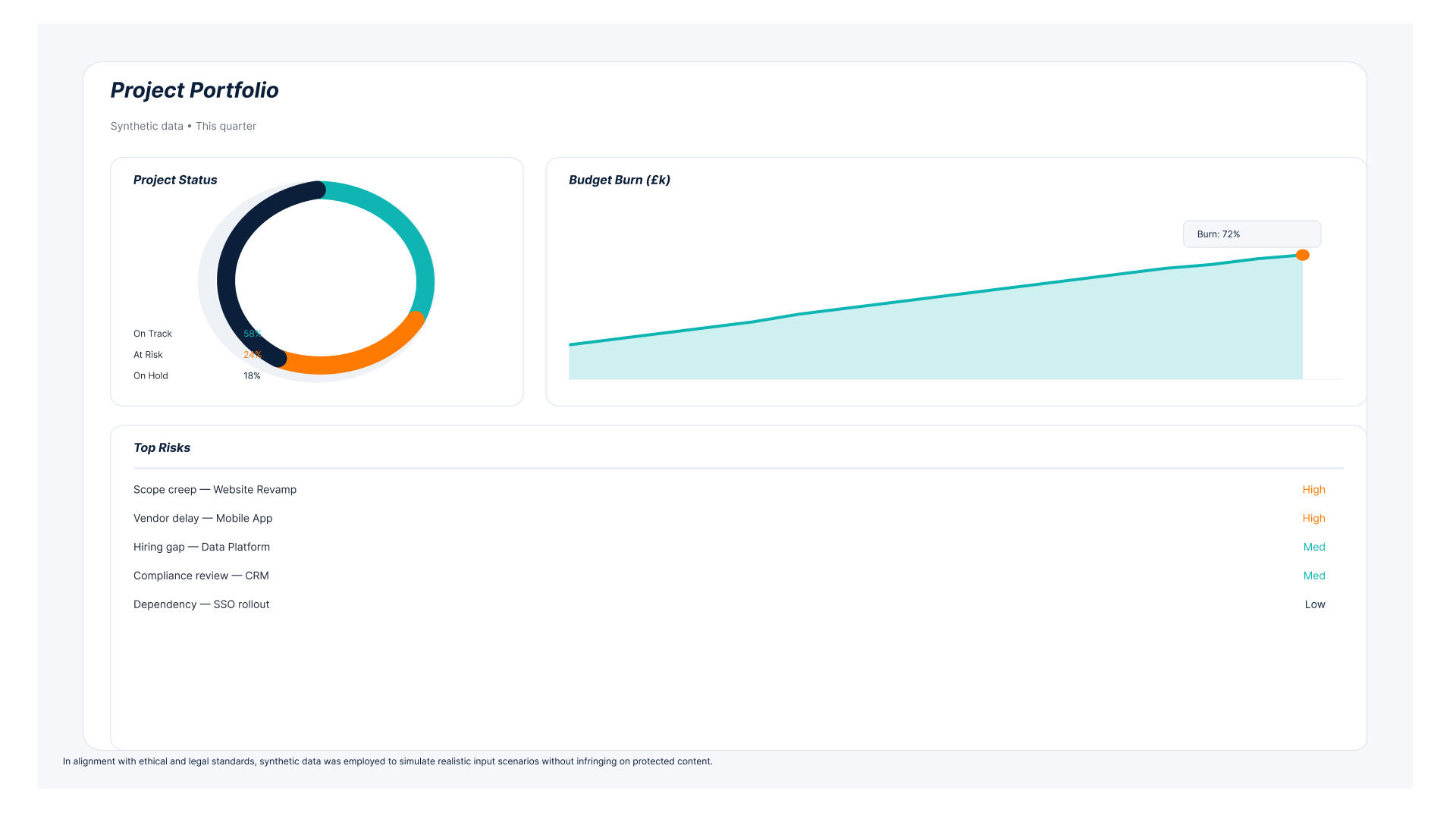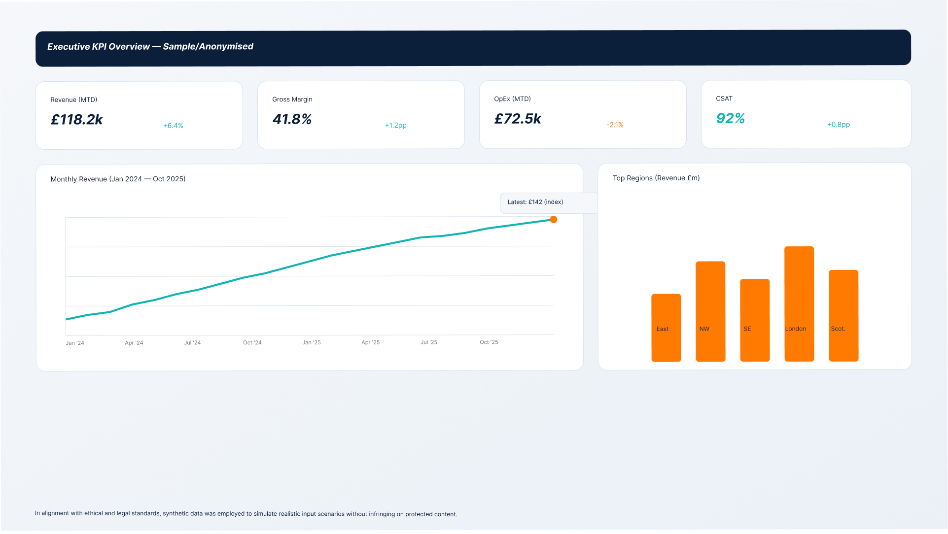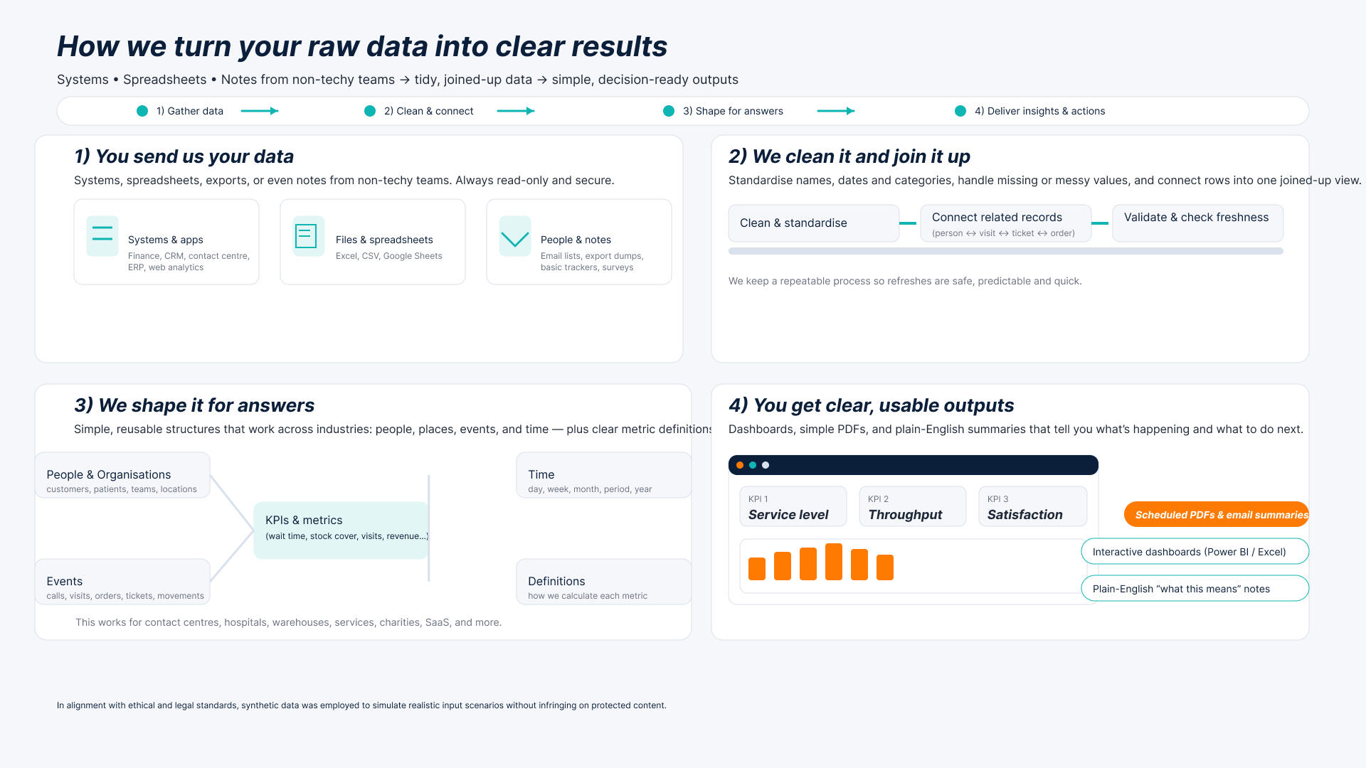 We follow a simple 4-step process. First, you send us your data – exports from systems, spreadsheets, or notes from your teams. Next, we clean and connect everything into one reliable, joined-up view. Then we shape it into clear KPIs and metrics so you can actually get answers to your questions. Finally, we deliver usable outputs – dashboards, scheduled PDF reports, and plain-English “what this means” notes that highlight key patterns, risks and opportunities, so your finance and ops teams can make confident, data-driven decisions.
