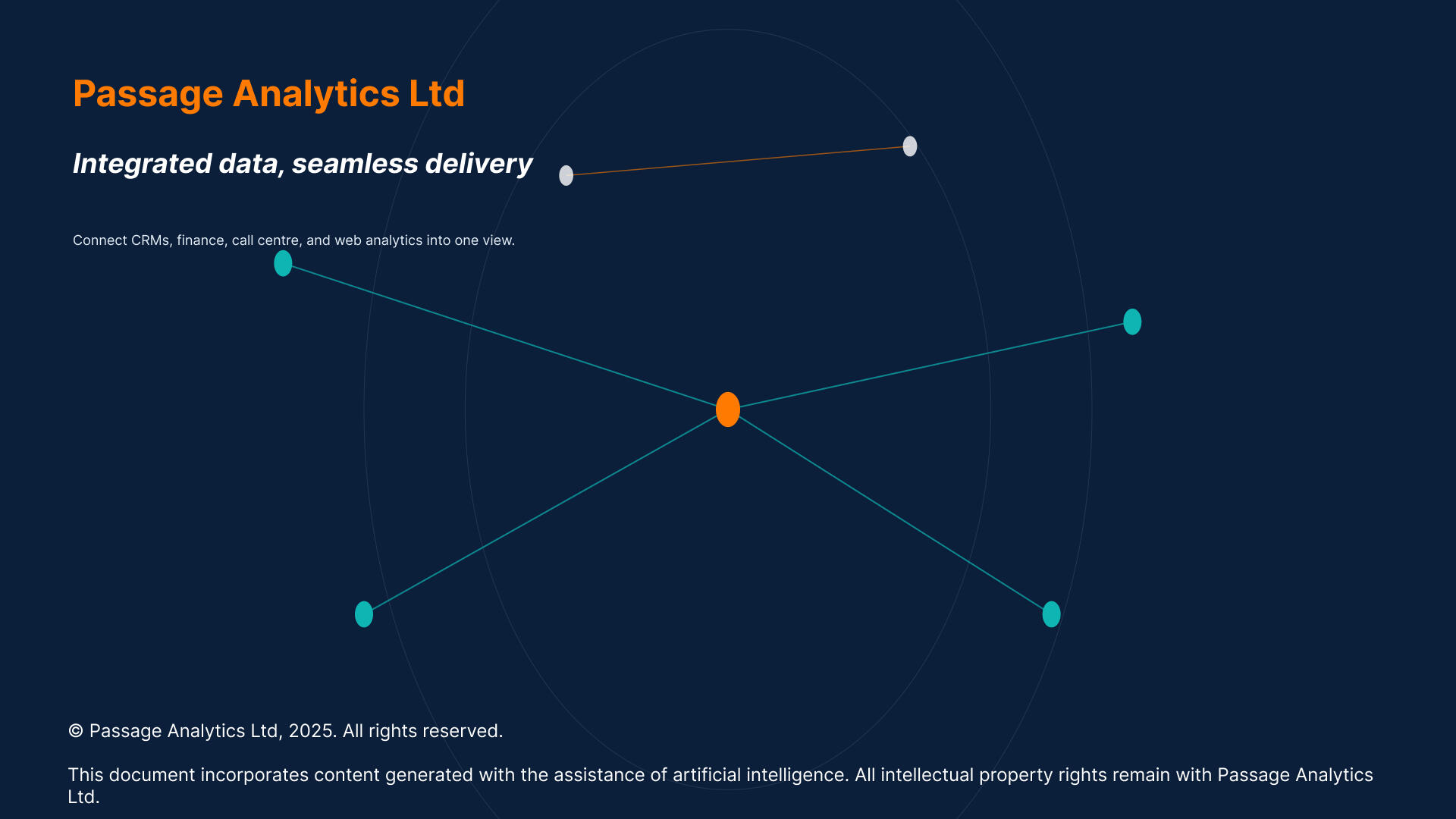 • But hard to do alone while running the day jobYou know the reporting is messy. You know you’re not seeing your KPIs clearly. But the work keeps getting pushed to “next quarter”.That’s exactly why Analytics Foundations exists at Passage Analytics.In a short, focused engagement, we help you:1. Agree the 5–10 KPIs that really matter for your finance and ops teams